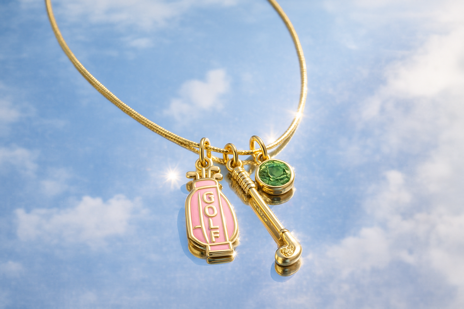 Shiny, golden and just a little extra. This charm necklace brings together three luxe golf-inspired pieces: a pastel pink enamel golf bag, a vintage-style club charm, and a sparkling green gem that catches the light like crazy. The whole piece sits on a sleek gold chain that glows against the skin.