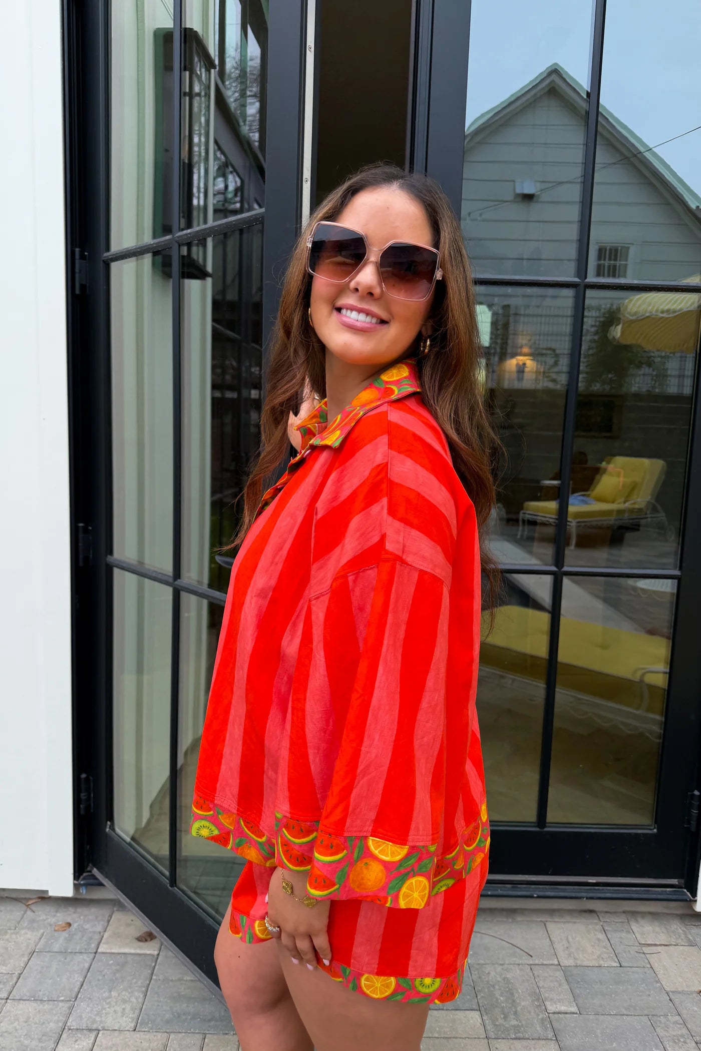 Brighten up your resort wardrobe with this bold striped button-down! The relaxed-fit top pairs effortlessly with the flowy drawstring (fruit punch shorts or pants)  for a chic yet comfortable set look. Fun, breezy, and effortlessly stylish—this set brings all the tropical vibes you need this season!