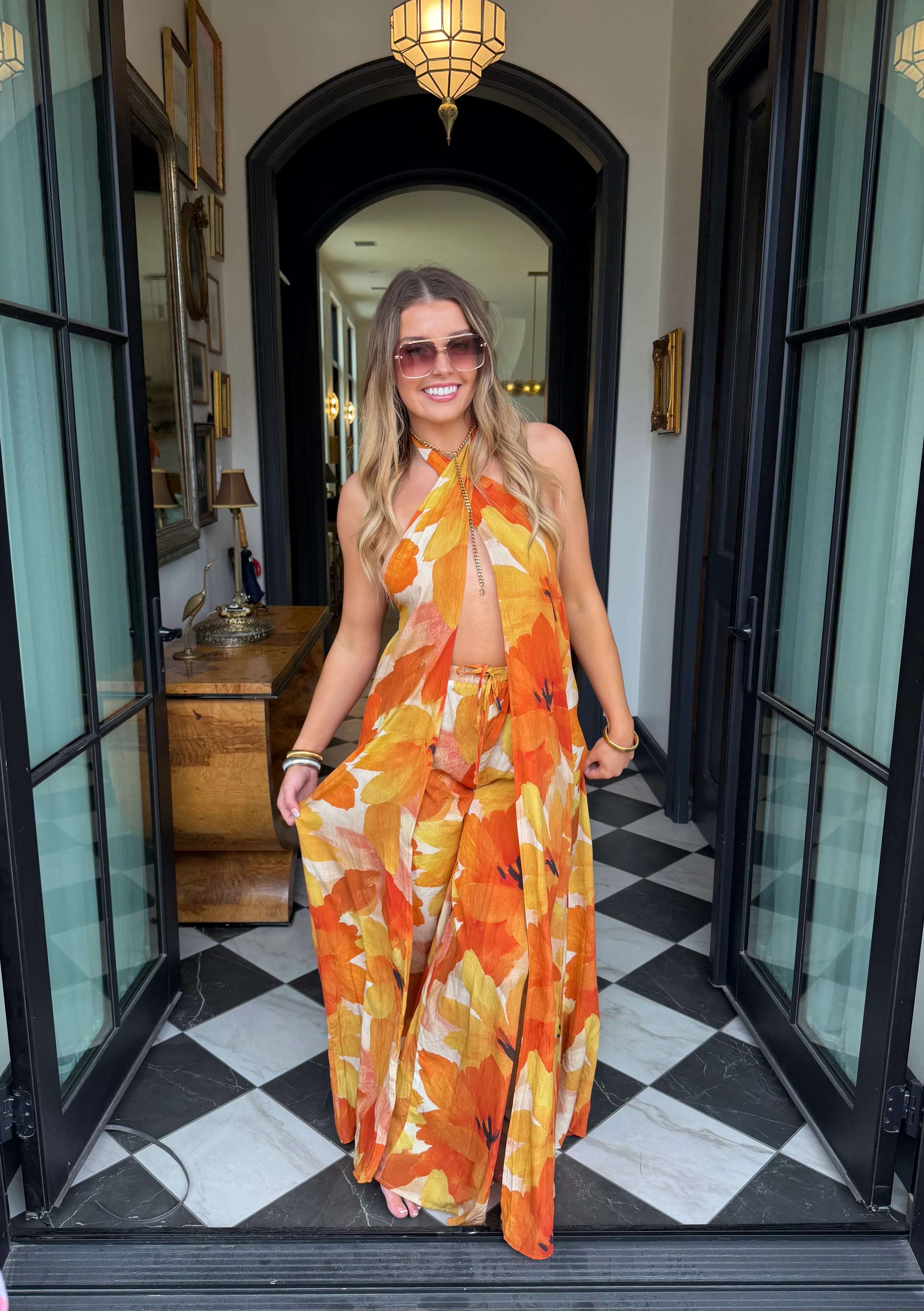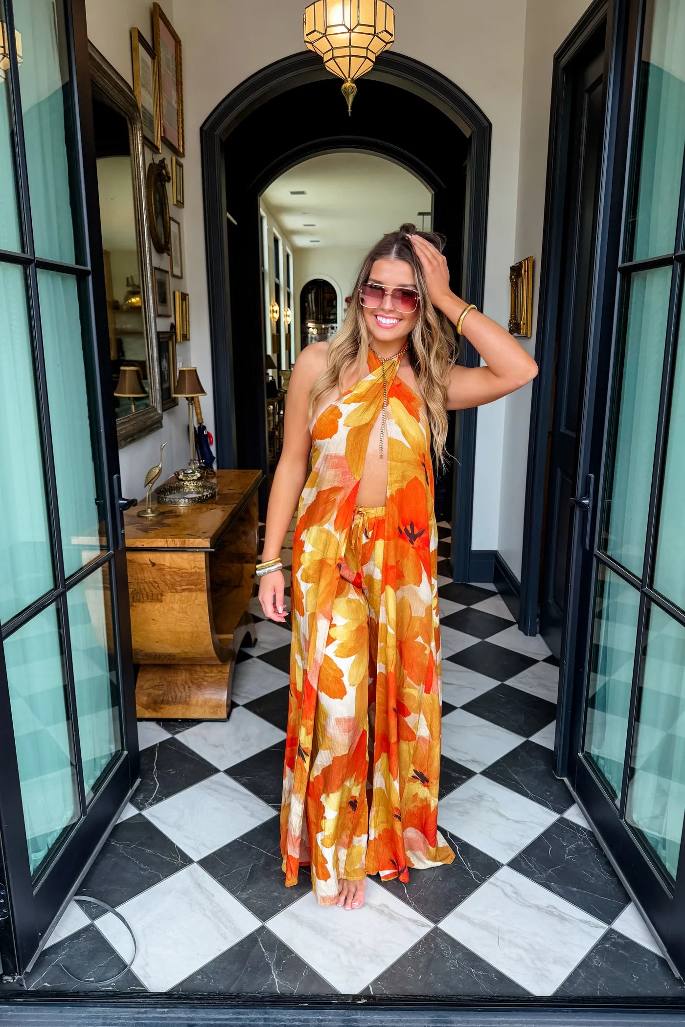 Turn up the heat in this stunning tropical halter two-piece set! Featuring a flowy open-front halter top and wide-leg pants (with elastic waist) with a breezy, relaxed fit, this set captures effortless resort style. The bold orange and yellow floral print radiates sunshine vibes, perfect for beach getaways, summer parties, or vacation strolls.