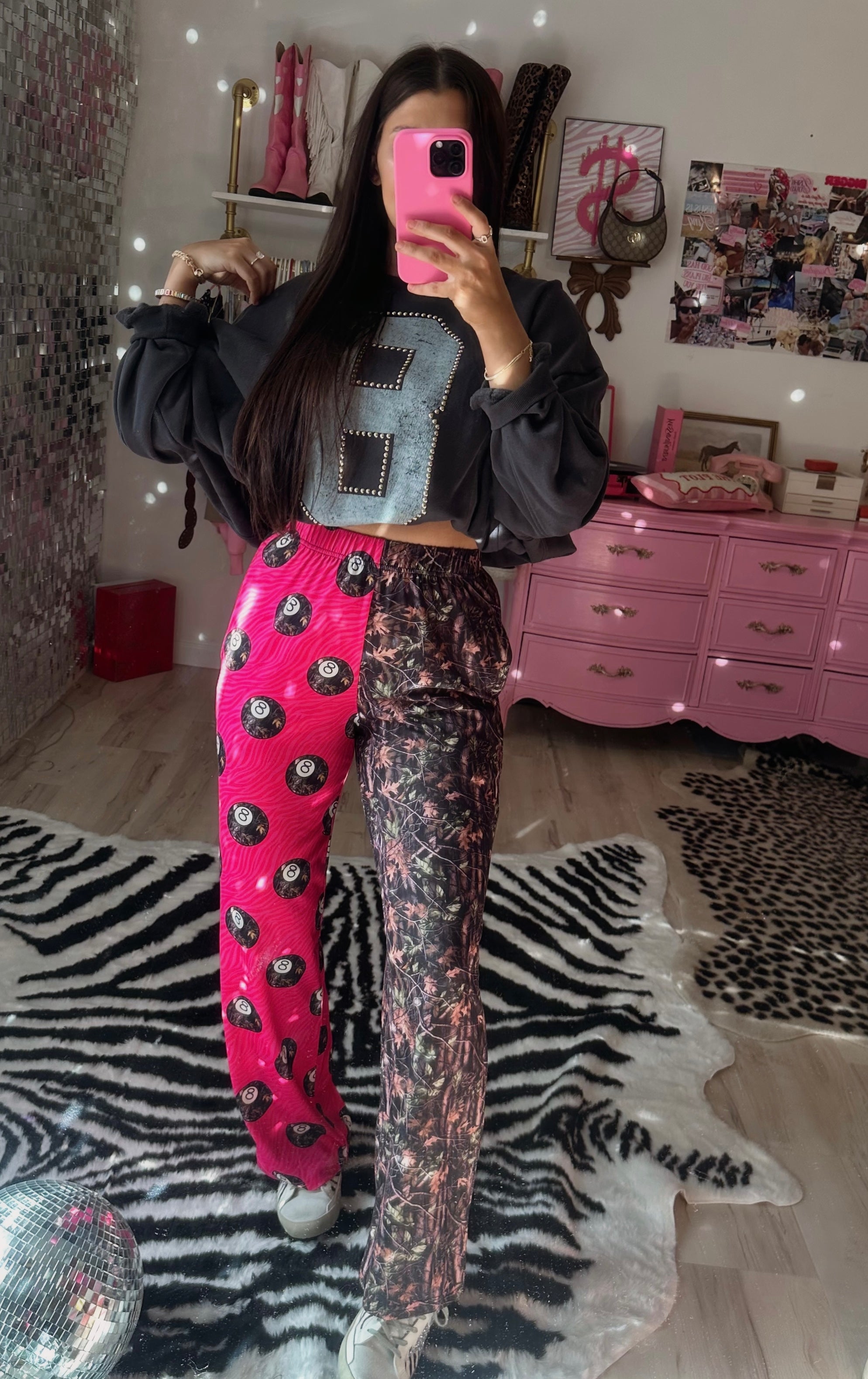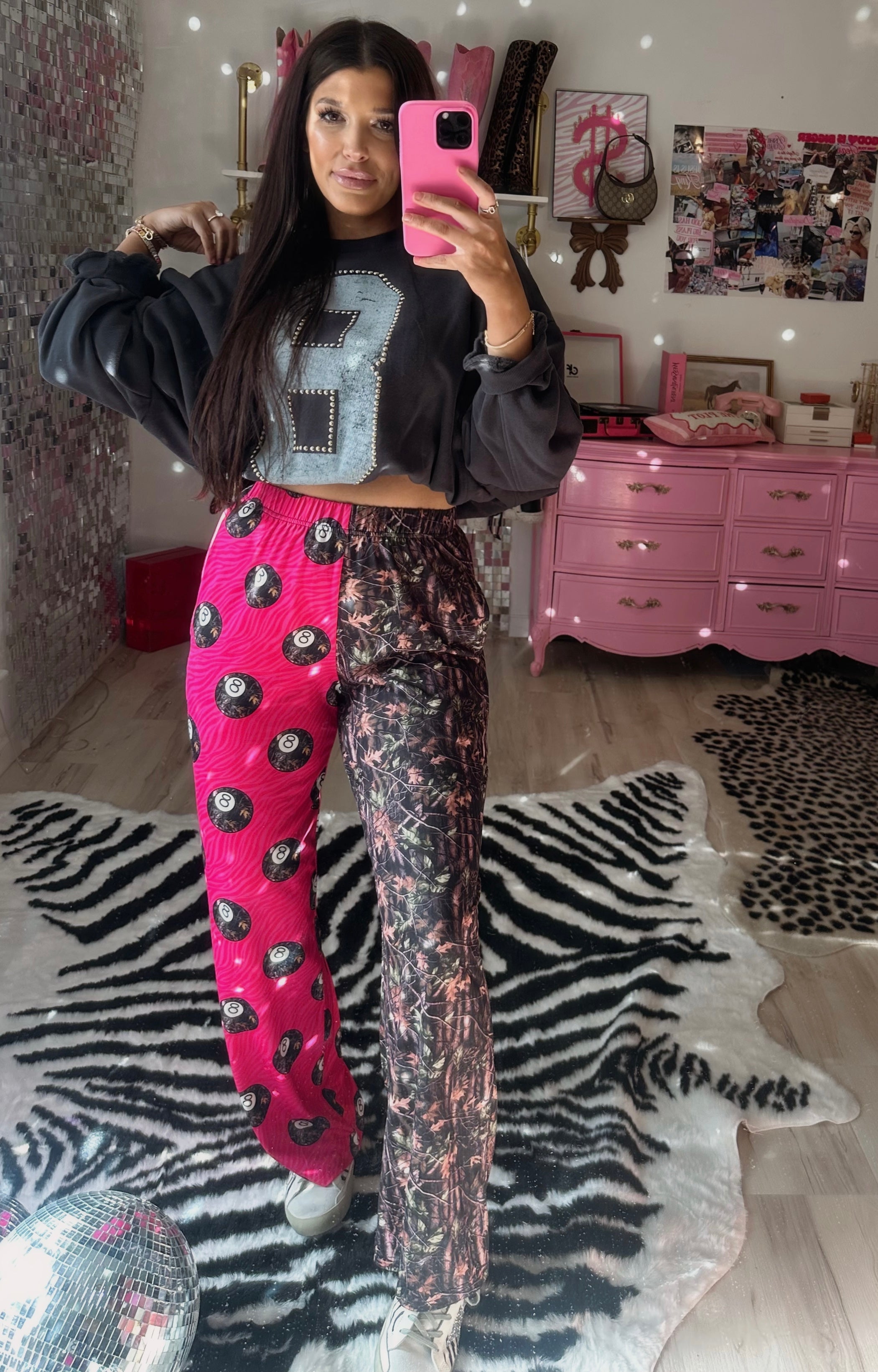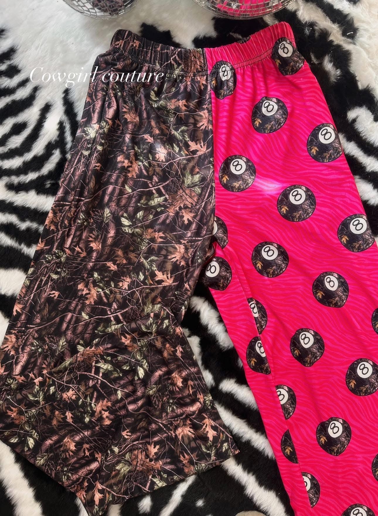 For the girls who mix cute with a little attitude. Bright pink 8 ball print on one leg, classic leopard on the other, with the same easy silhouette that feels like loungewear but looks like you planned the outfit.
