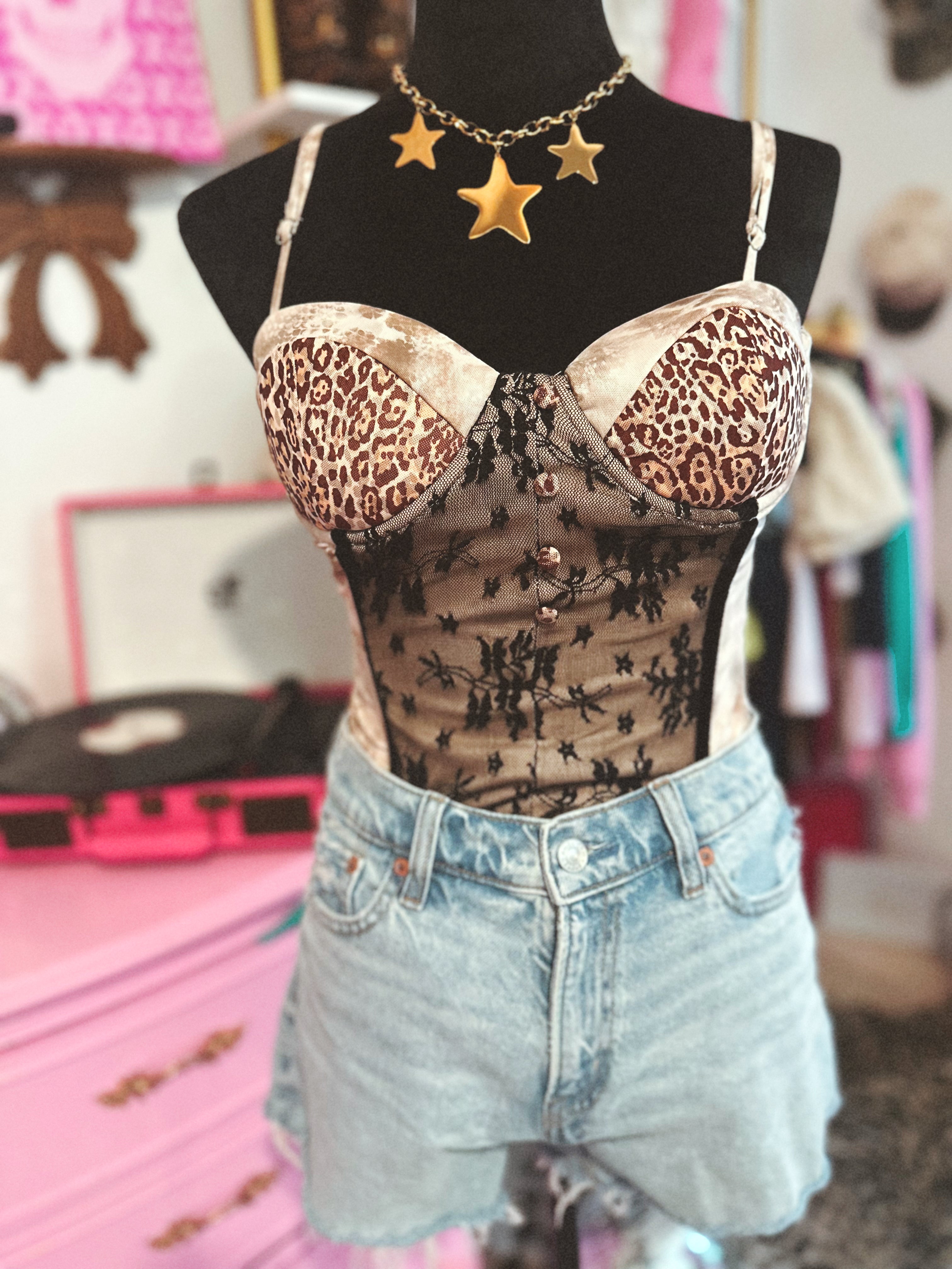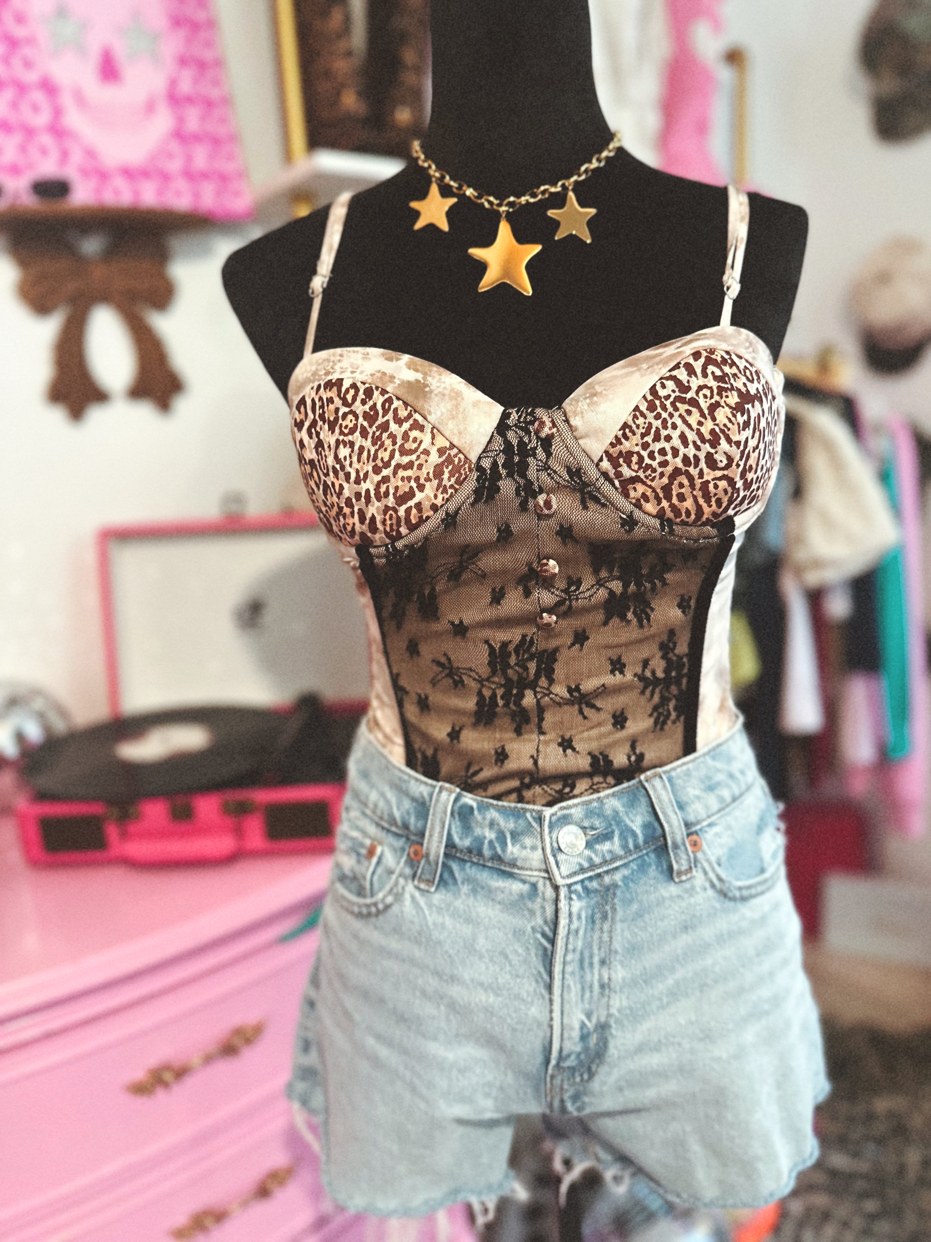 This bustier-style top is a total showstopper ✮ featuring luxe leopard print cups with supportive underwire and sheer lace paneling that cinches the waist for the most flattering fit. The lace detailing gives the illusion of a smaller waist while still keeping it stretchy and comfortable. It zips up the back for easy wear and has just the right amount of give so you can stay true to size.