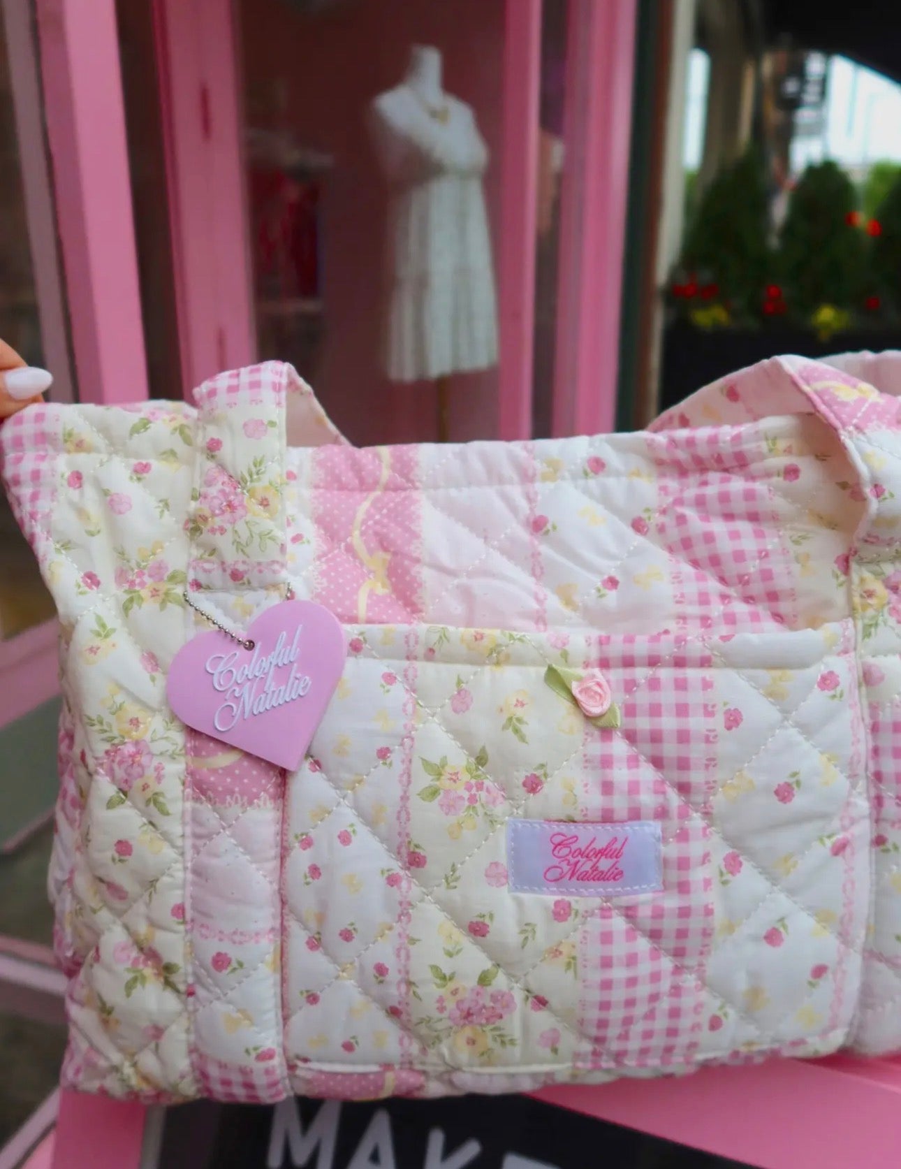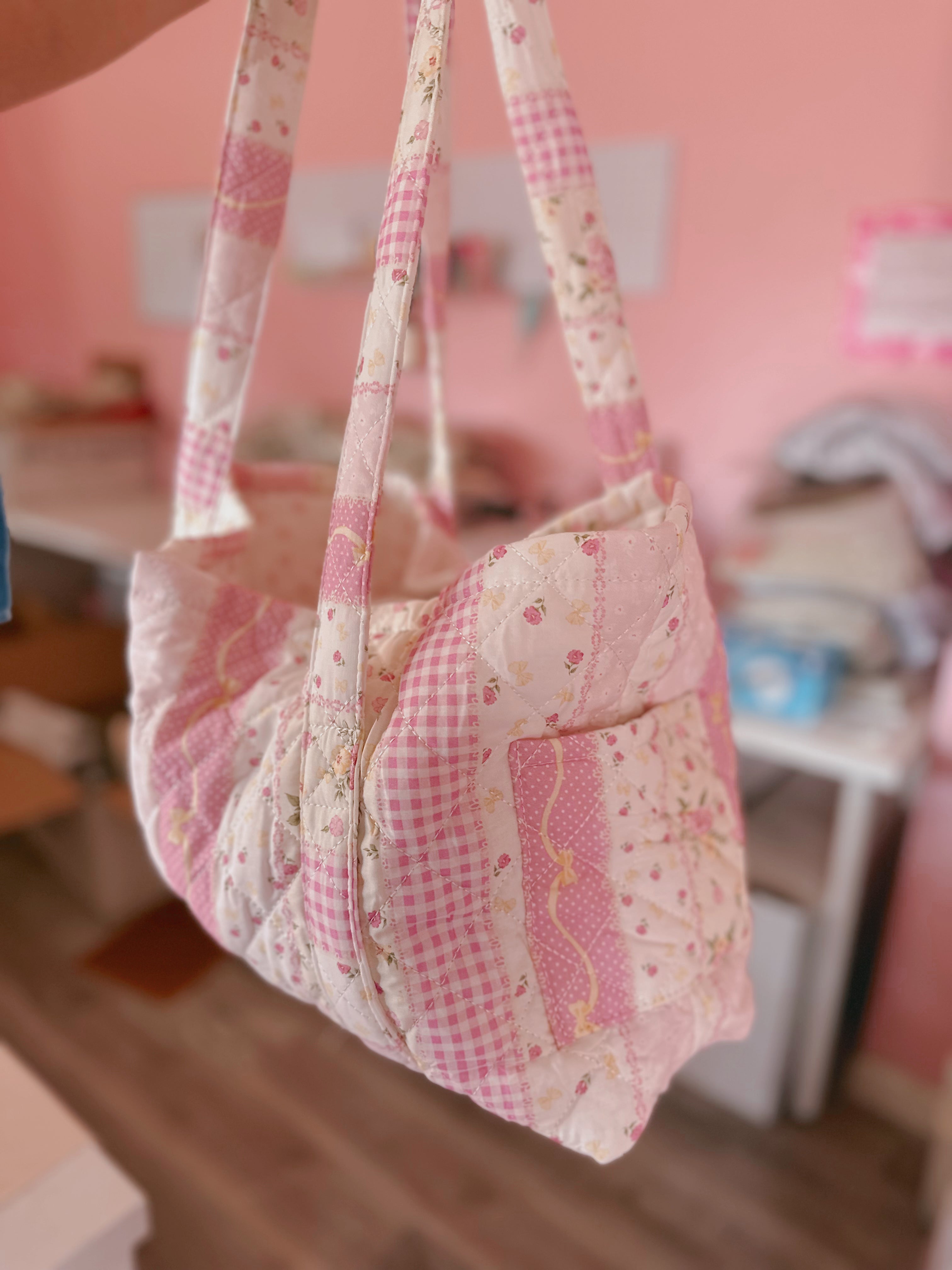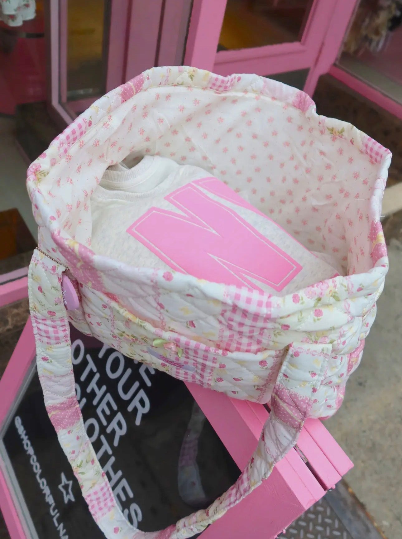 The ultimate girly work bag—big enough for your laptop, planner, and 12 lip glosses (priorities). Made from a dreamy pink patchwork quilt fabric that feels straight out of a vintage fairytale. Lightly padded for structure but still soft and cozy. Features long shoulder straps and a roomy interior with a front pocket for your must-grabs.