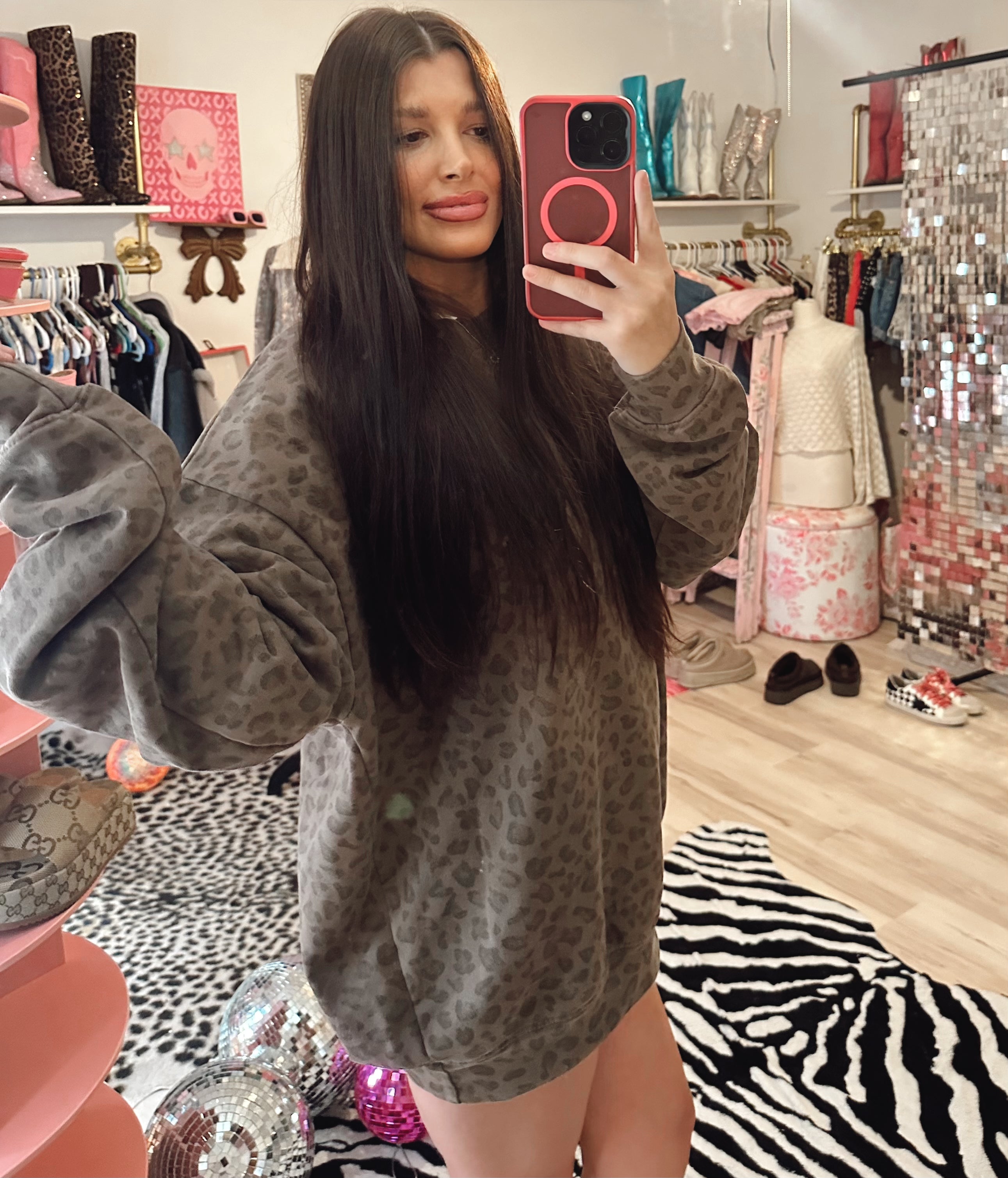 leopaed cotton crew. Unisex slightly oversized fit! model is 5’3 0-2 small wearing a size large!