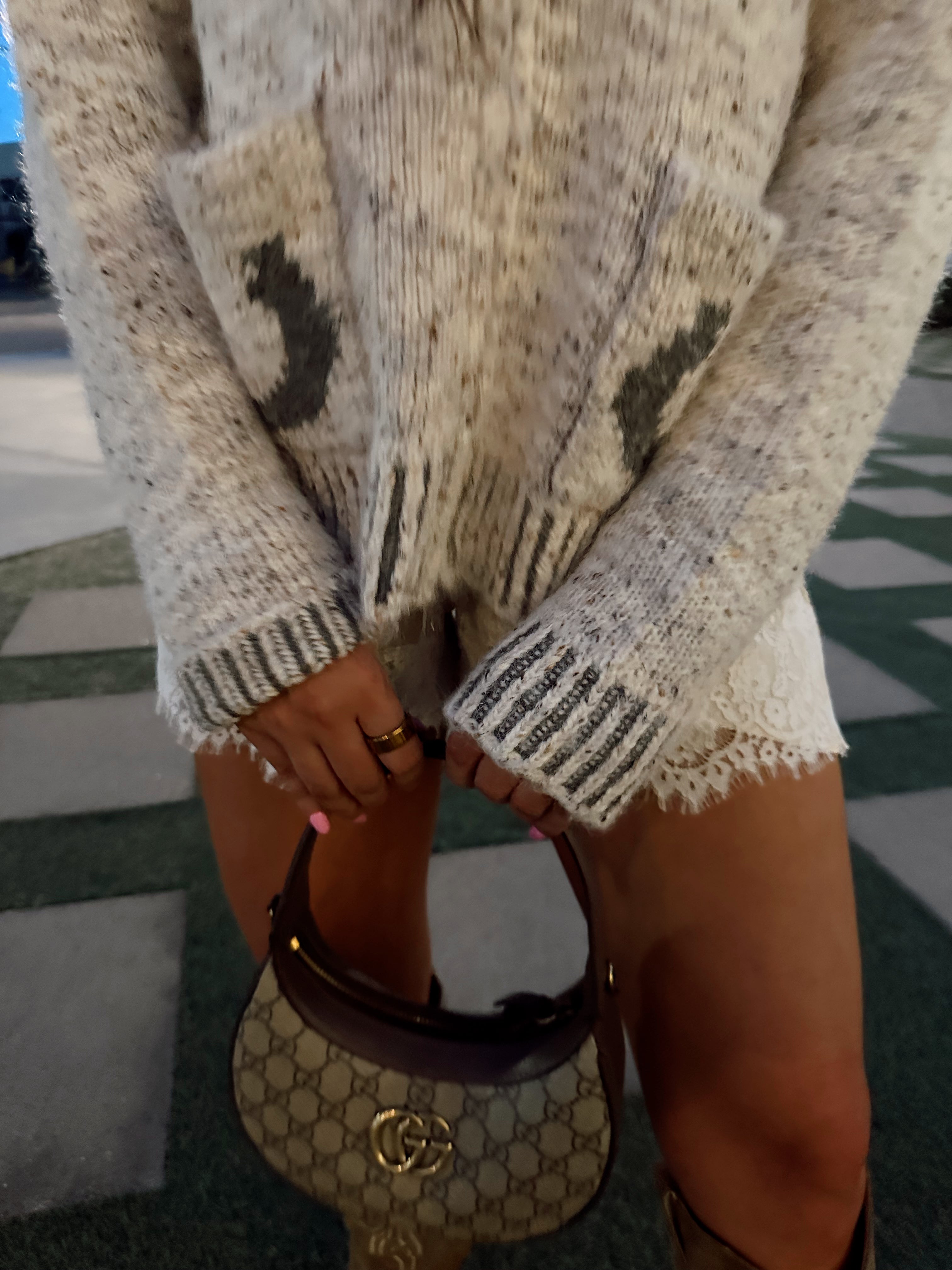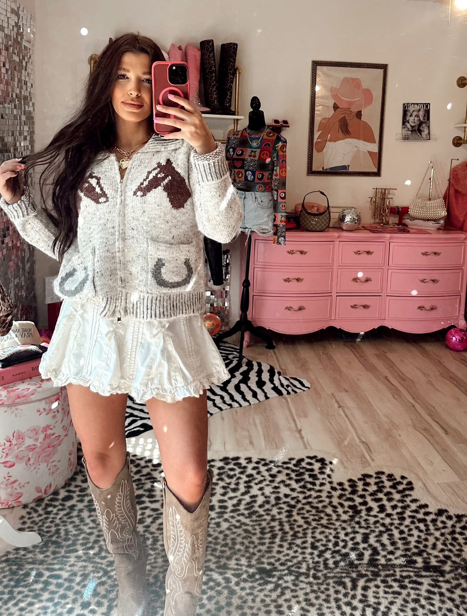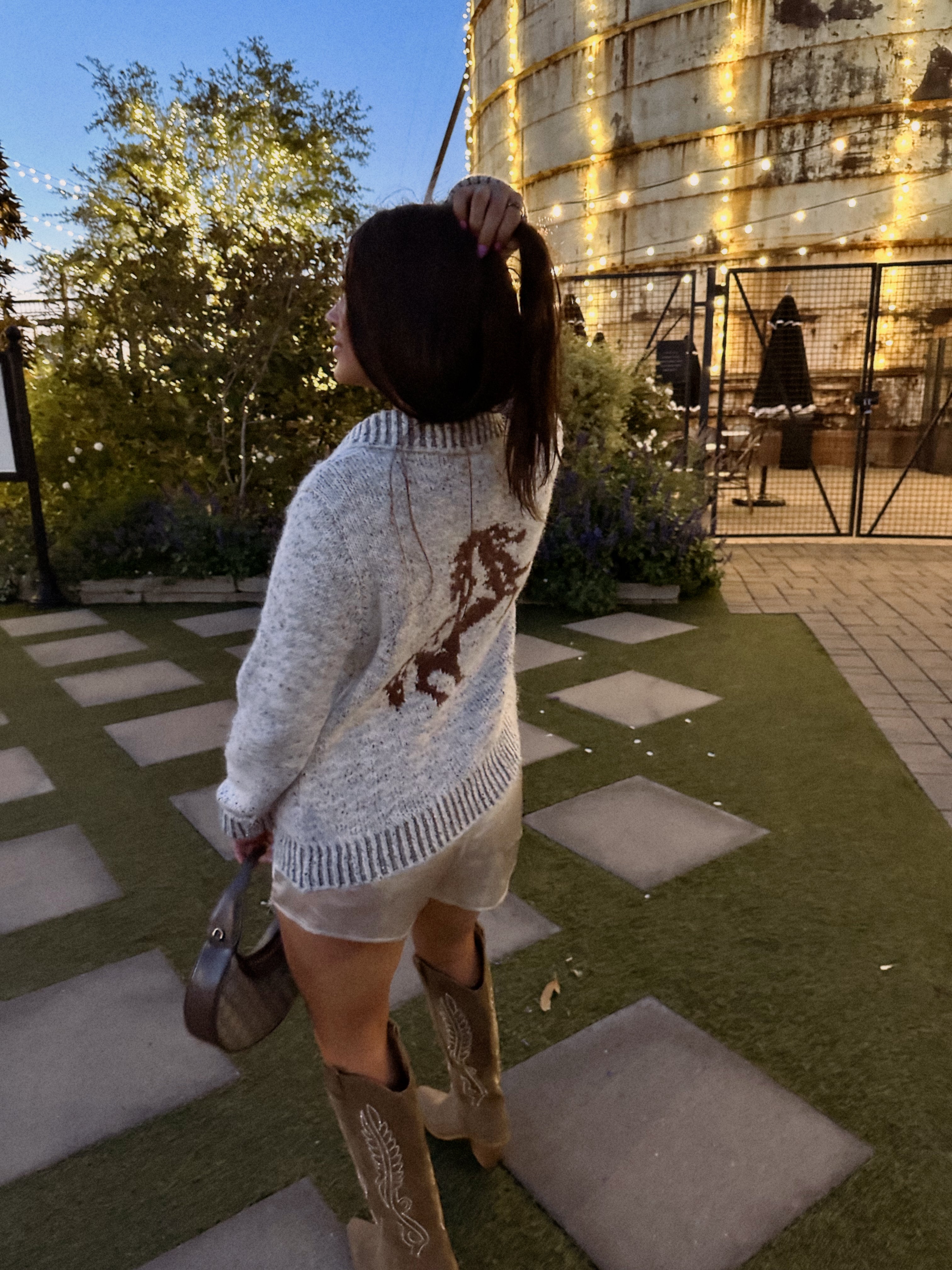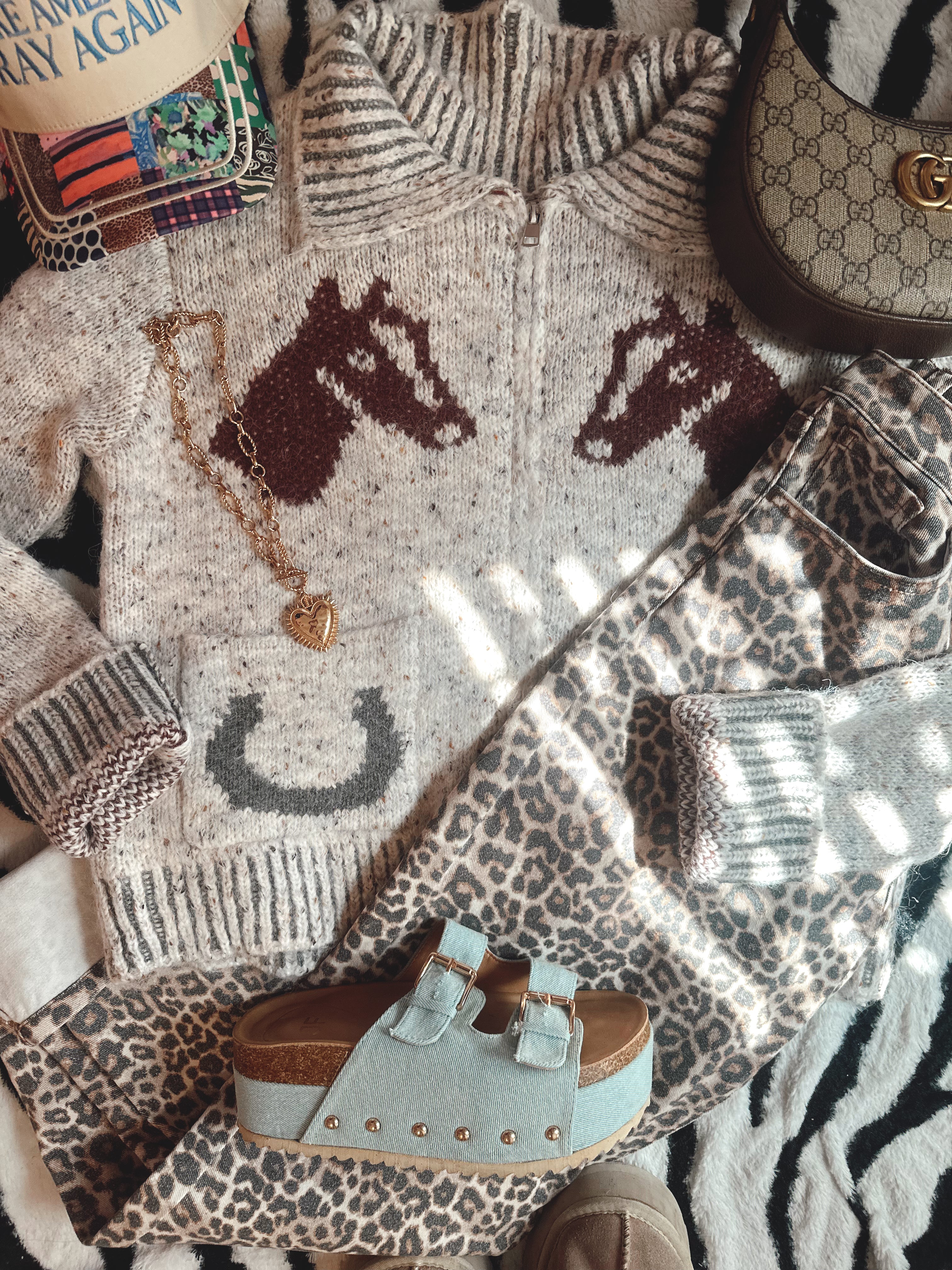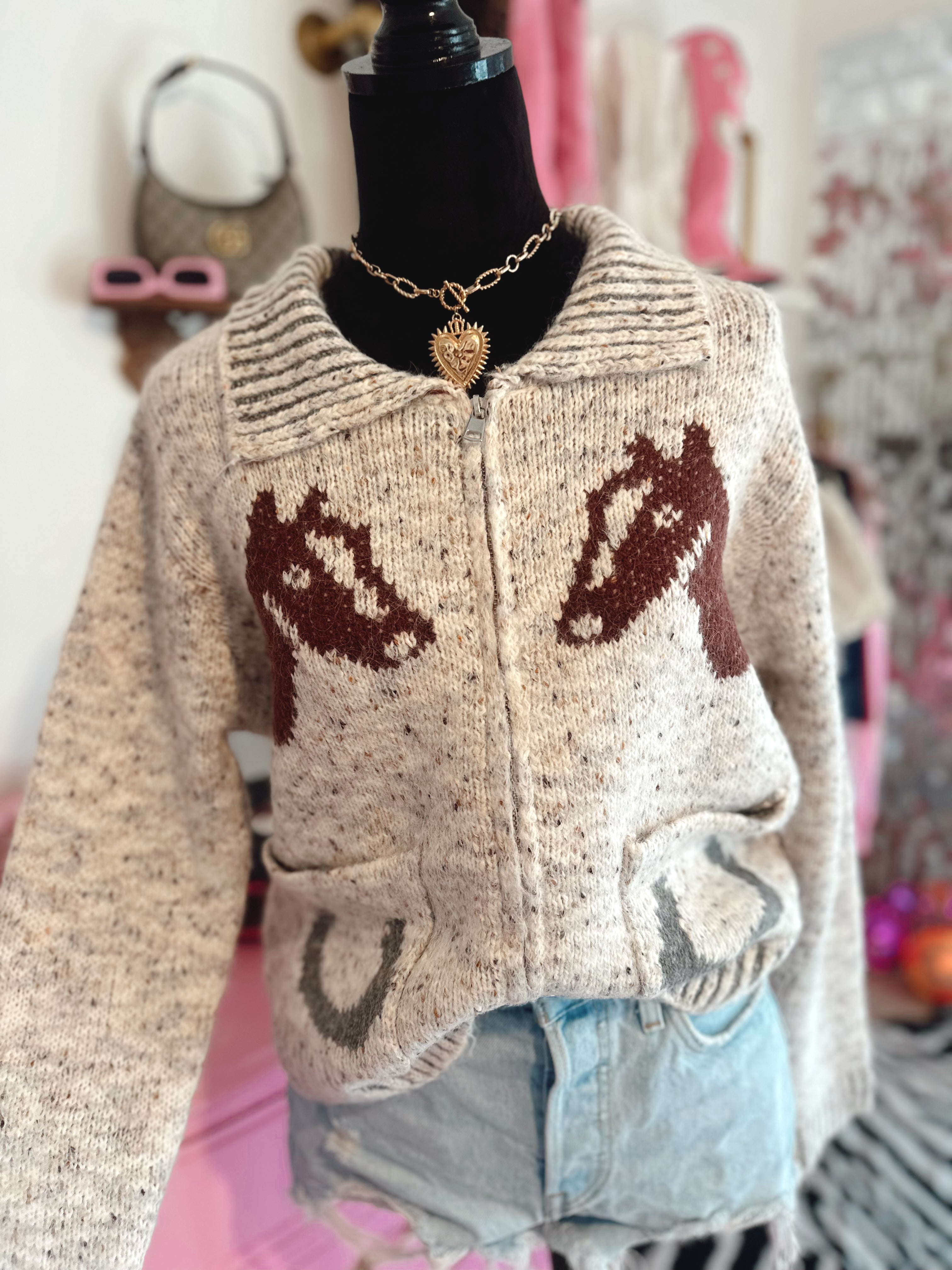 Vintage western energy meets luxe fall layering 🤎 This marled zip-up sweater features horse motifs on the front and back with lucky horseshoe pockets that feel straight out of a retro ranch movie. Cozy, medium-weight knit with the softest lived-in feel — the kind you’ll actually reach for every chilly morning.