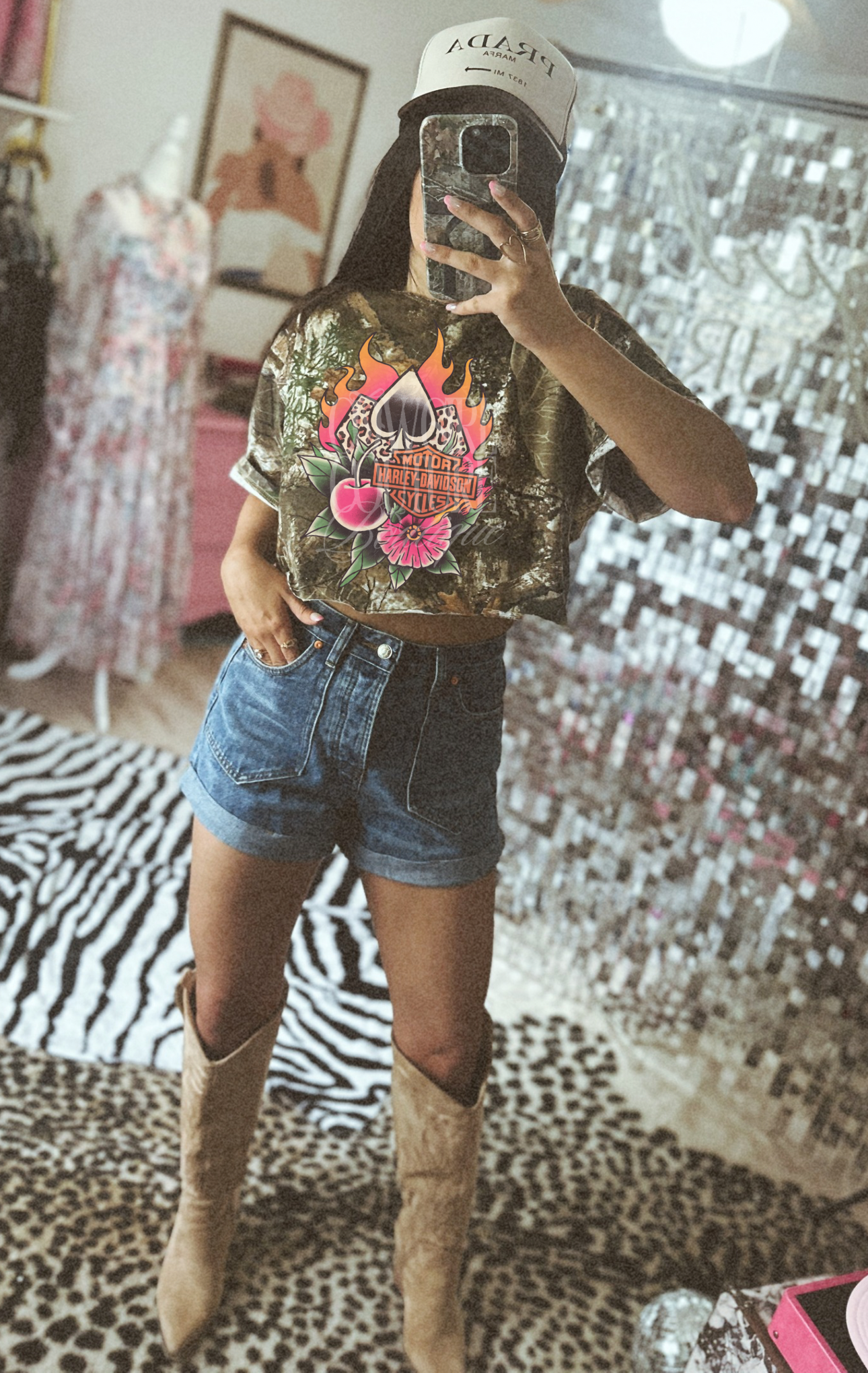 Cherry Spade Vintage Biker Cropped Camo Tee